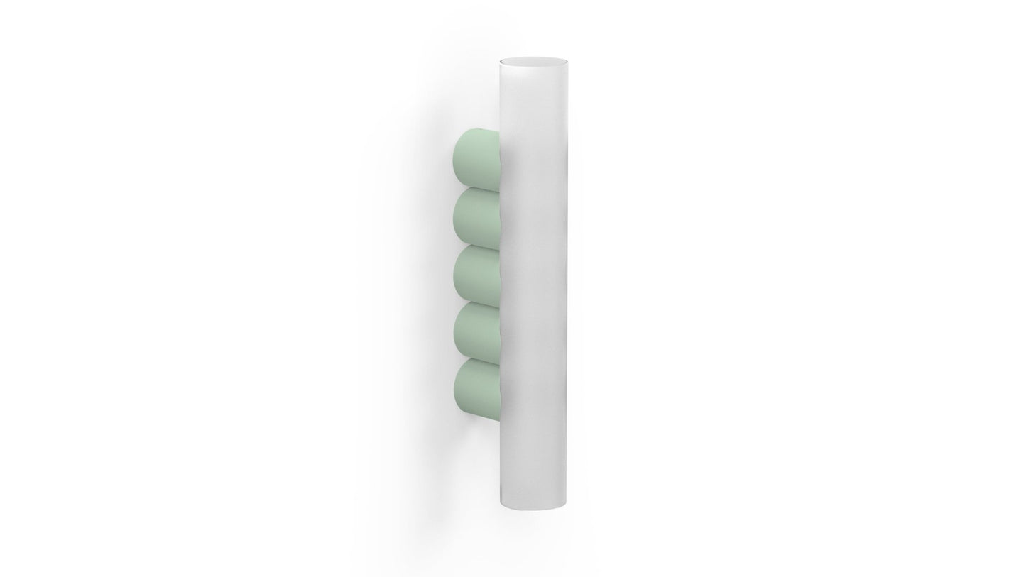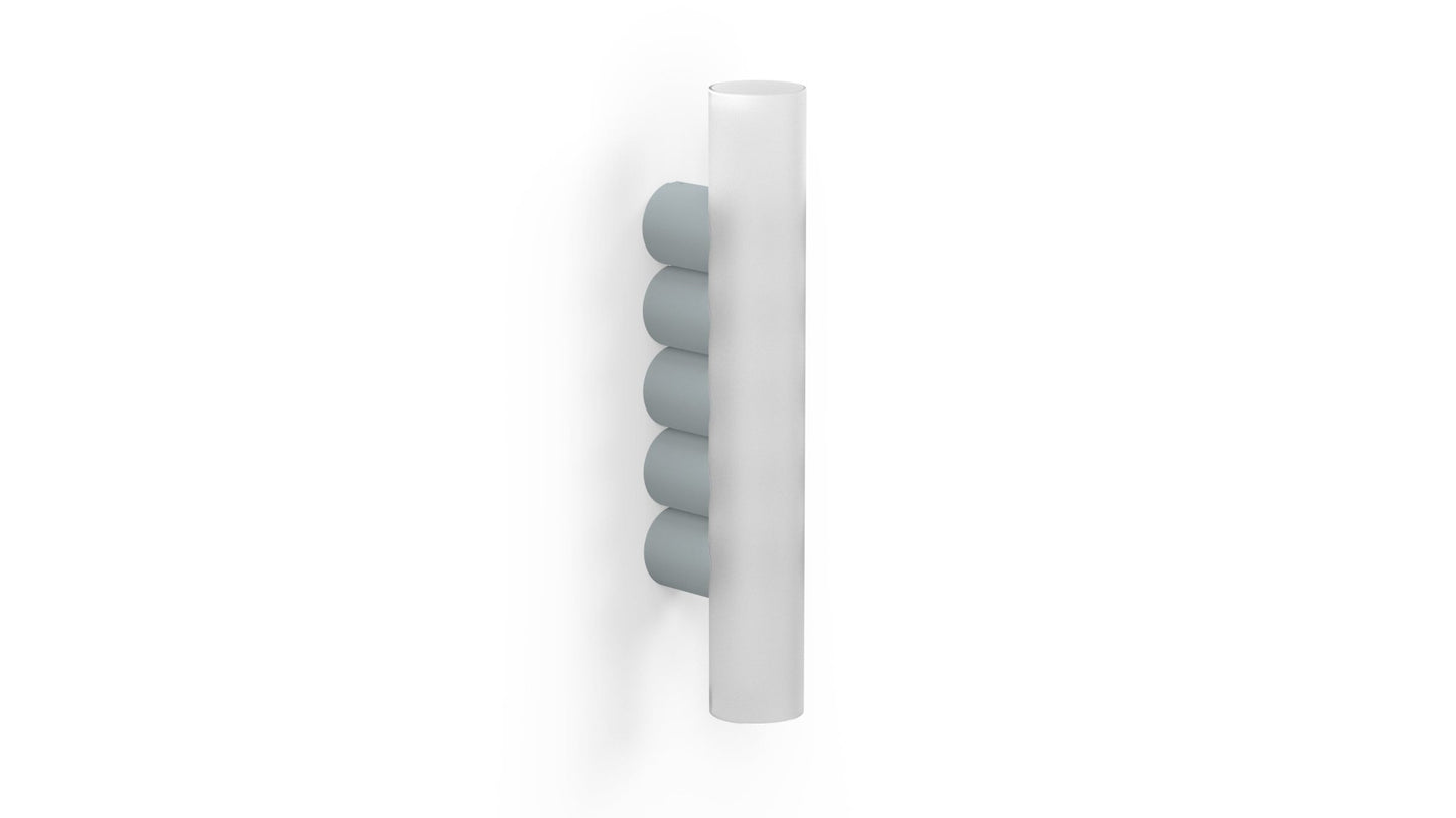 The Multitude wall light is made of a sandblasted glass tube and metal cylinders. It is available in a variety of colors. It can be mounted horizontally or vertically on the wall. Its installation requires a wall outlet.
