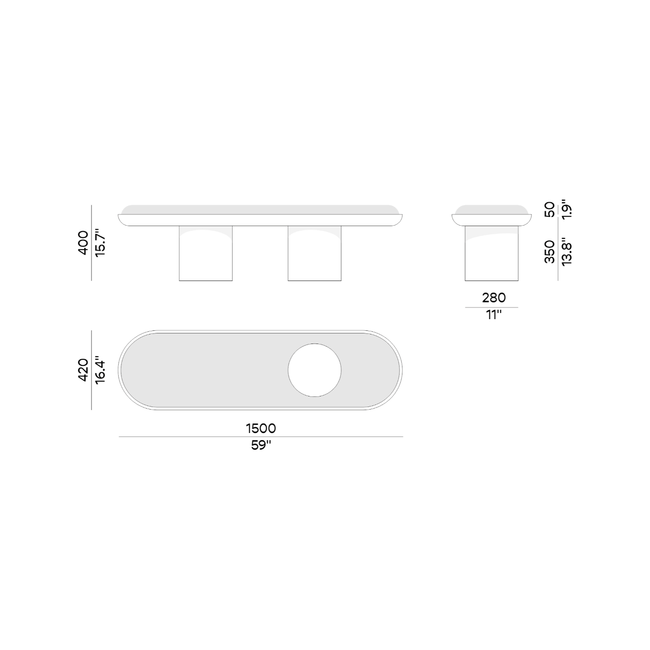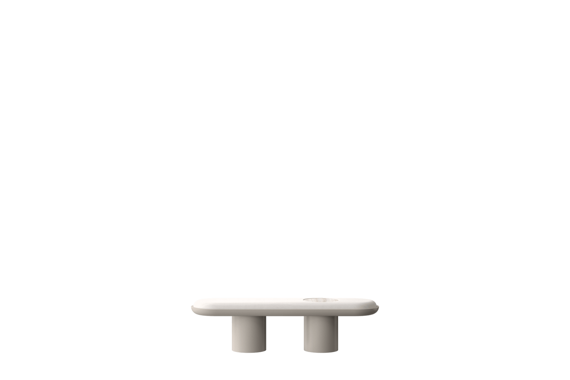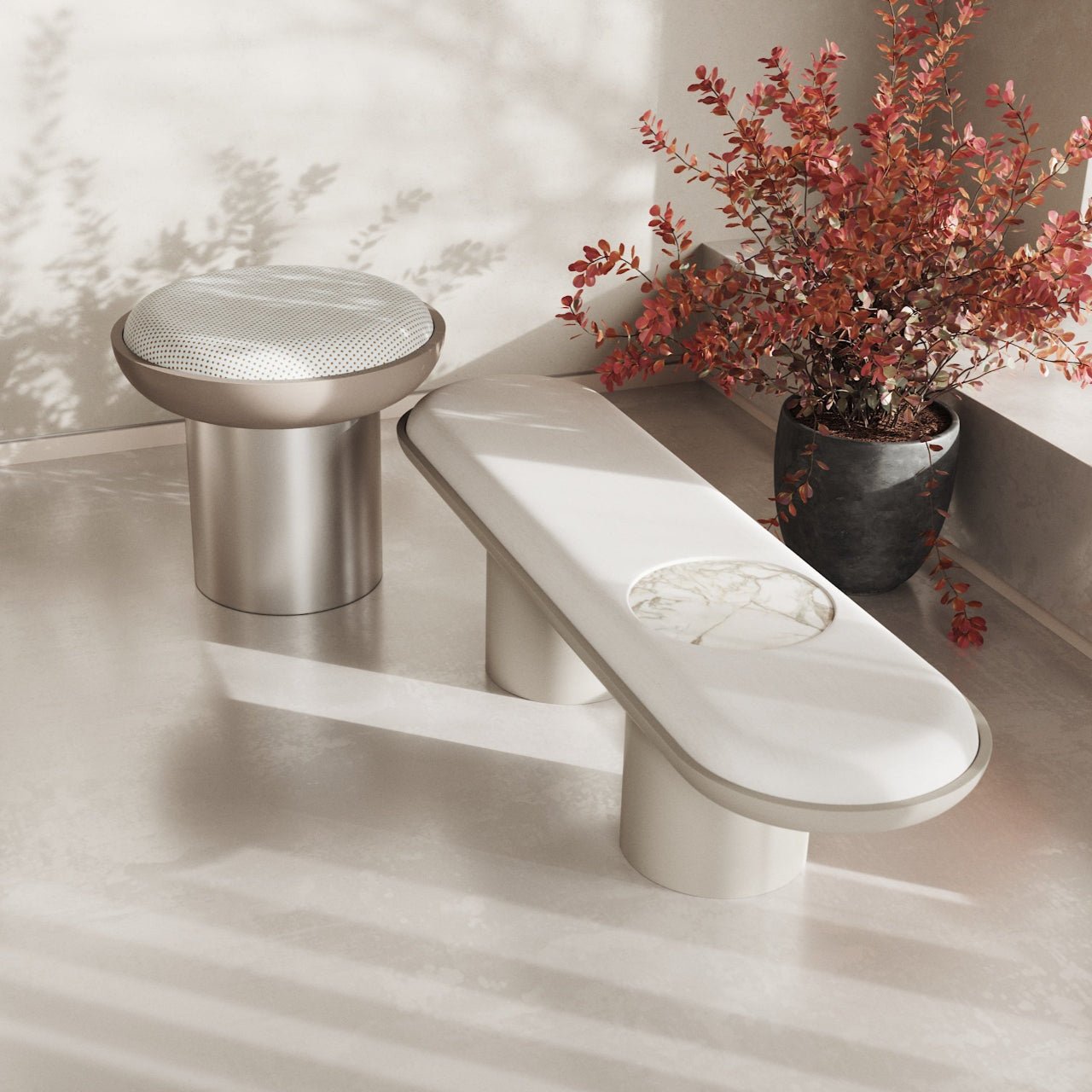 With its soft silhouette and clean lines, the LIVIA bench transforms seating into a true architectural gesture. Its elongated top rests on two cylindrical legs, giving it a visual balance that is both strong and delicate.