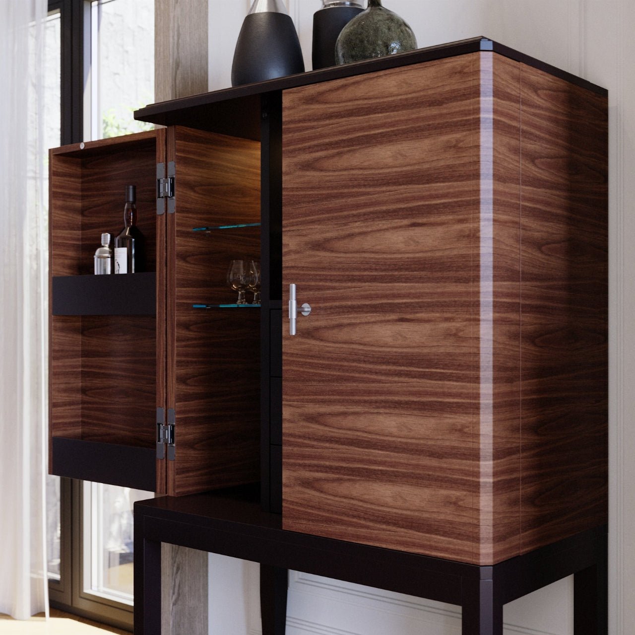 The G.BAR bar cabinet in Canaletto walnut is an ode to functional elegance. Designed for lovers of design and the art of living, it combines sophistication and practicality in a resolutely contemporary spirit. Its noble wood structure is enhanced by a matte lacquered interior, housing an engraved mirror, LED lighting, three drawers, extra-clear glass shelves, and bottle pockets integrated directly into the doors.