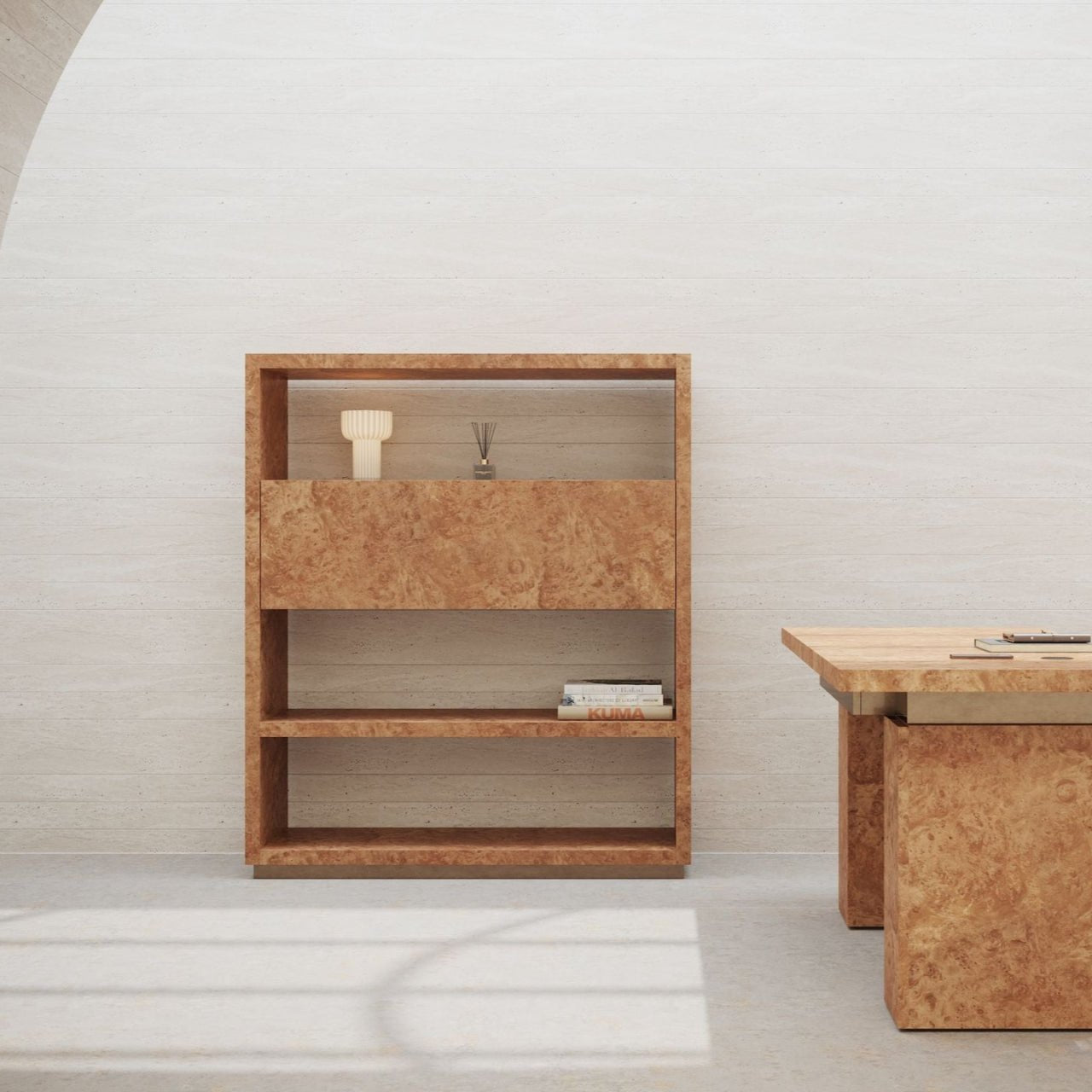 Halfway betweencontemporary consoleAndgraphics library, thereNINAofULTRAMOBILIexplores a design that is as functional as it is sculptural. Its open rectangular structure highlights arare and textured wood: therechestnut burl, whose natural grain makes each piece unique.