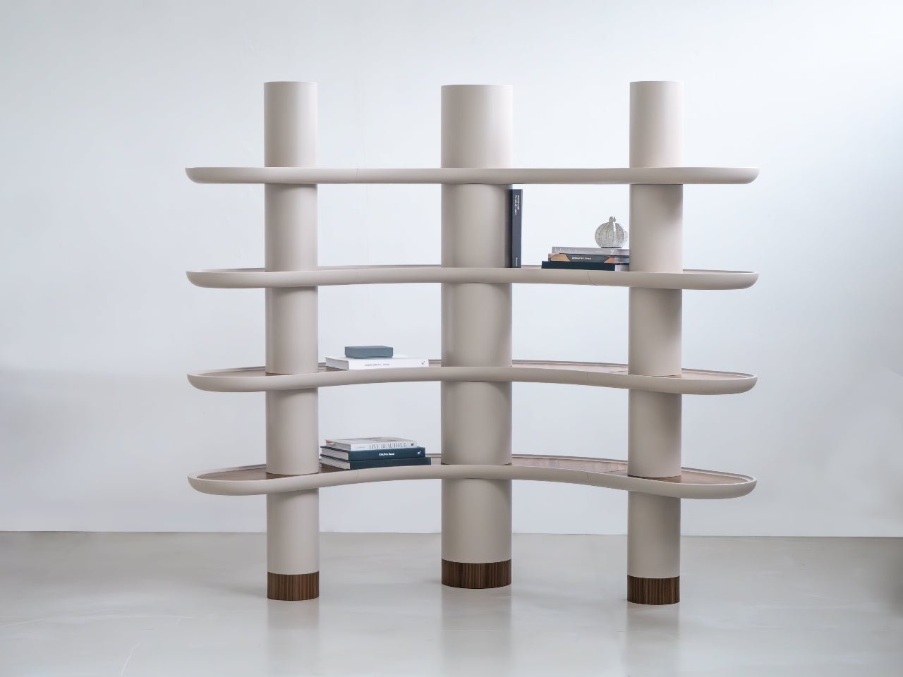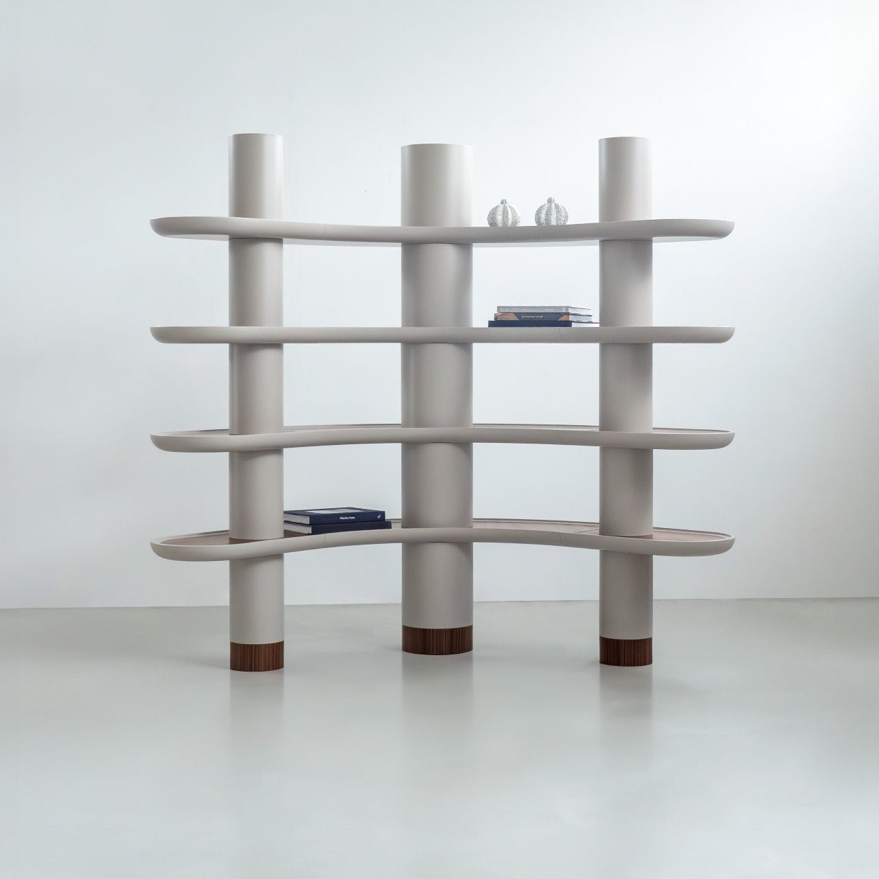 Designed to lean against a corner or to be placed at the end of an architectural perspective, it is composed of4 solid shelves 6 cm thick, resting onthree cylindrical columns, with acurved angle R100 cmA piece of furniture with a strong visual impact, ideal for creating a unique decorative rhythm.