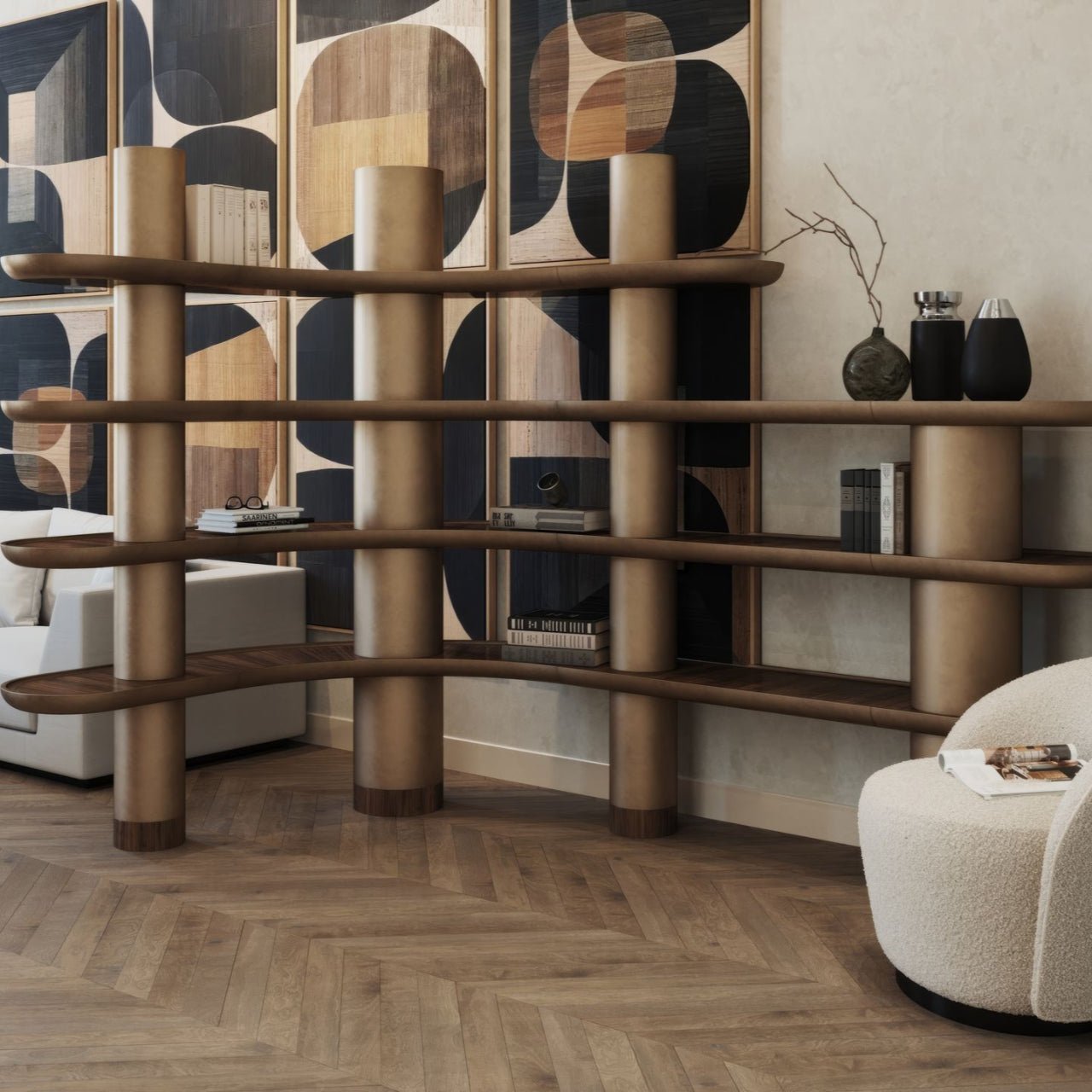 ThereMINA VINTAGE libraryis aarchitectural work in its own right, designed to enhance a corner of space while asserting a strong aesthetic identity. In this version,ULTRAMOBILIassociates thewarmth of Canaletto walnutto the soft glow of thepatinated bronze, for a presence that is at once elegant, warm and contemporary.