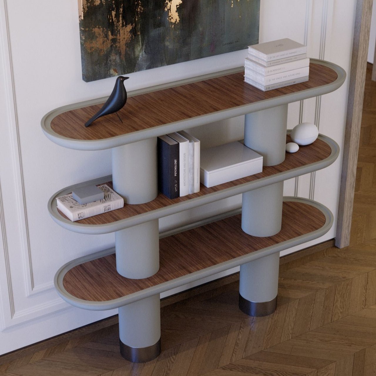 UseMINA 3As a subtle divider in an open room, it structures the space without weighing it down. On the shelf, alternate art objects, architecture books, and a minimalist vase to reinforce its gallery feel.