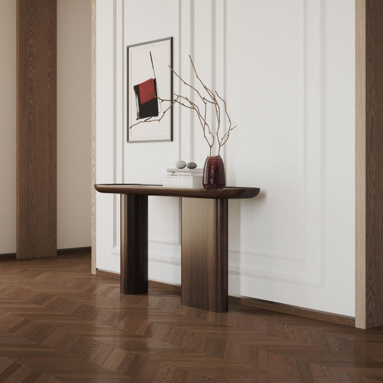 Because it reflects our love ofexceptional pieces. We were immediately captivated by the deep glow of this glossy smoked eucalyptus, which captures the light like a plant mirror. The CRETA is much more than a piece of furniture: it is autilitarian work, designed to enhance the most refined entrances, living rooms or professional spaces.