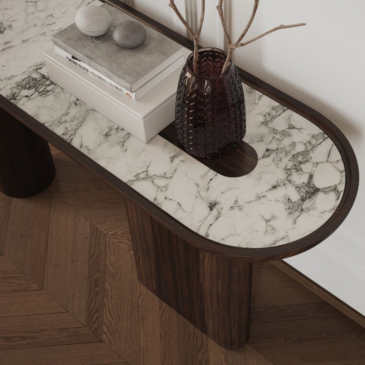 Oval console in glossy smoked eucalyptus and CRETA marble – ULTRA MOBILI