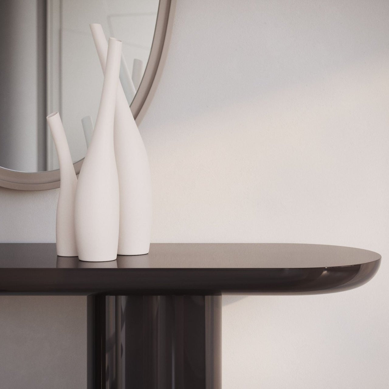 Sculptural, elegant, and infinitely brilliant. The EVA console table, finished in glossy black, draws attention with its play of reflections and minimalist shapes. Composed of two deep black lacquered cylinders supporting a top with softened edges, it embodies a rare balance between architectural strength and decorative refinement.