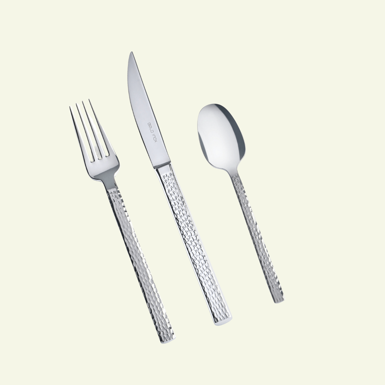 Crafted in Portugal, this 18/10 stainless steel cutlery features a distinctive hammered finish and ergonomically designed handles for a comfortable grip. Its unique design is perfect for any occasion, from everyday dining to elegant entertaining.