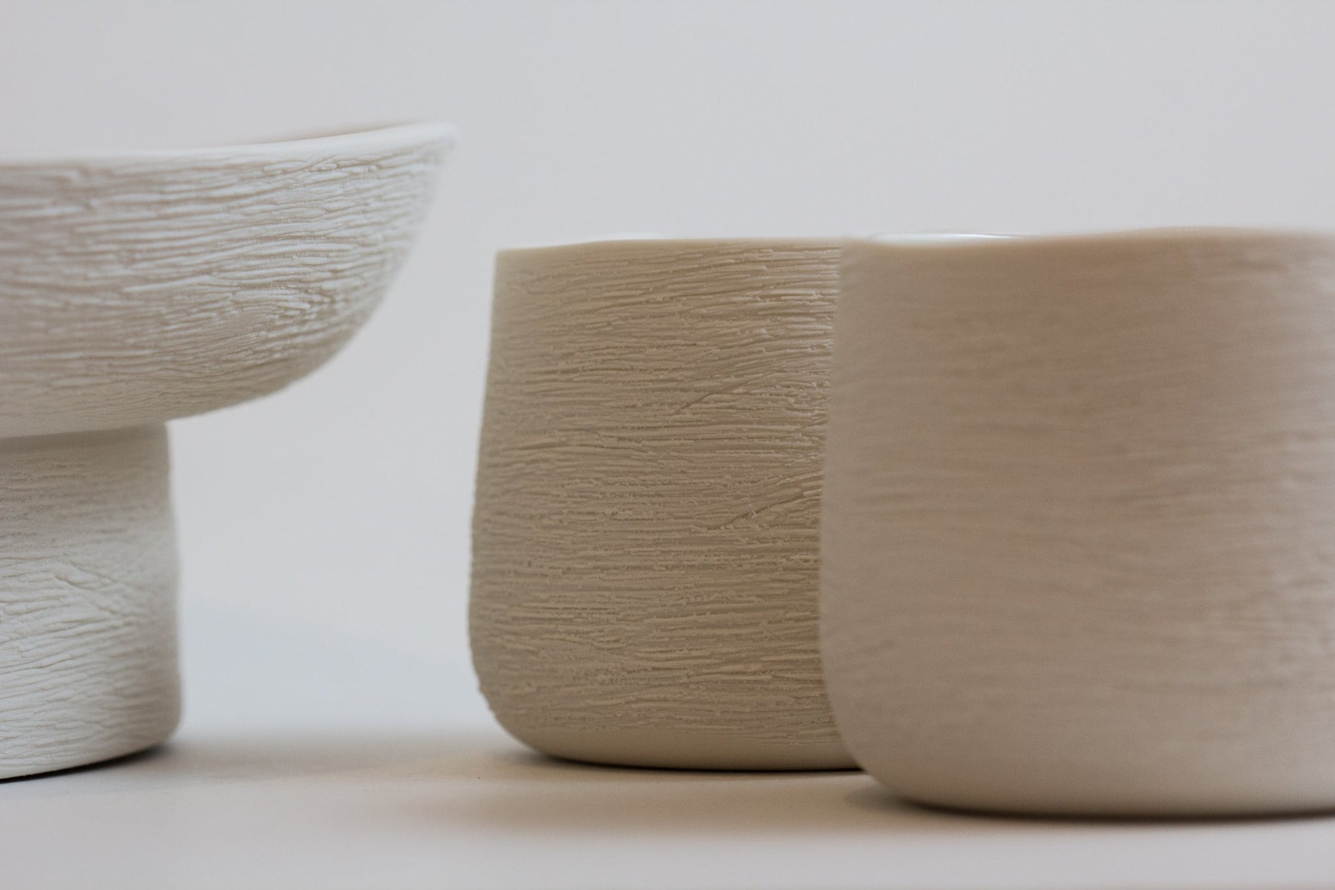 Thisset of three white porcelain tumblers with branding, signBérangère Noyau, embodies everyday elegance through minimalist design and hand-crafted texture.