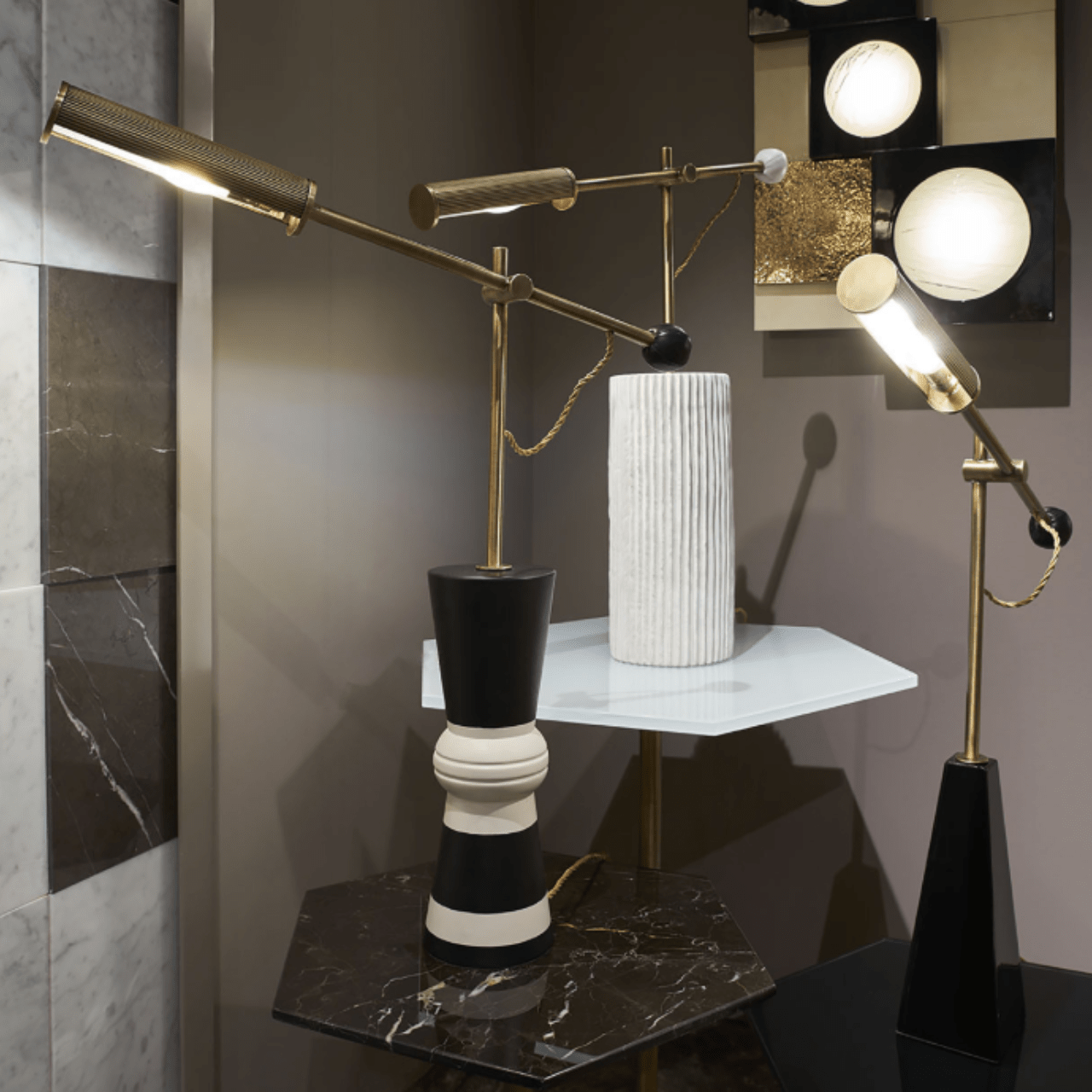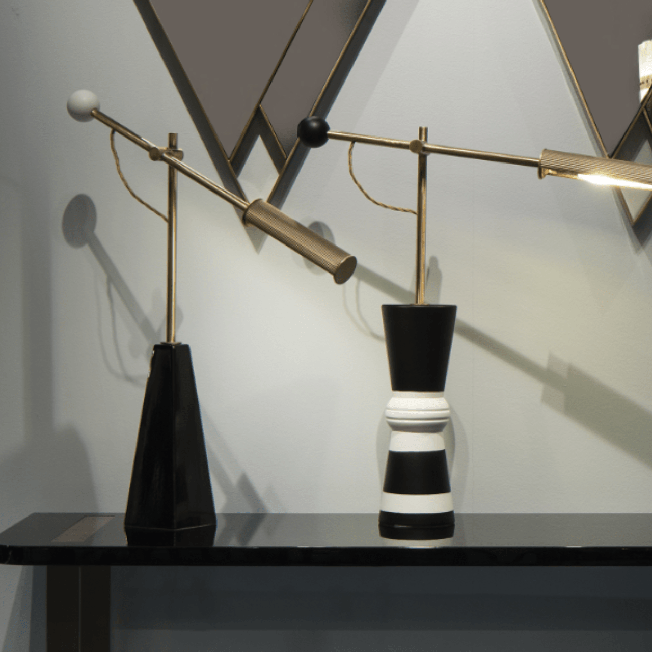 Goldie, in this bold version, makes light an exercise in graphic style. Its base inblack and white glazed ceramic, worked like a sculptural totem, immediately catches the eye. It is topped with abrushed brass horizontal arm, delicately balanced by a black counterweight and a ribbed diffuser.