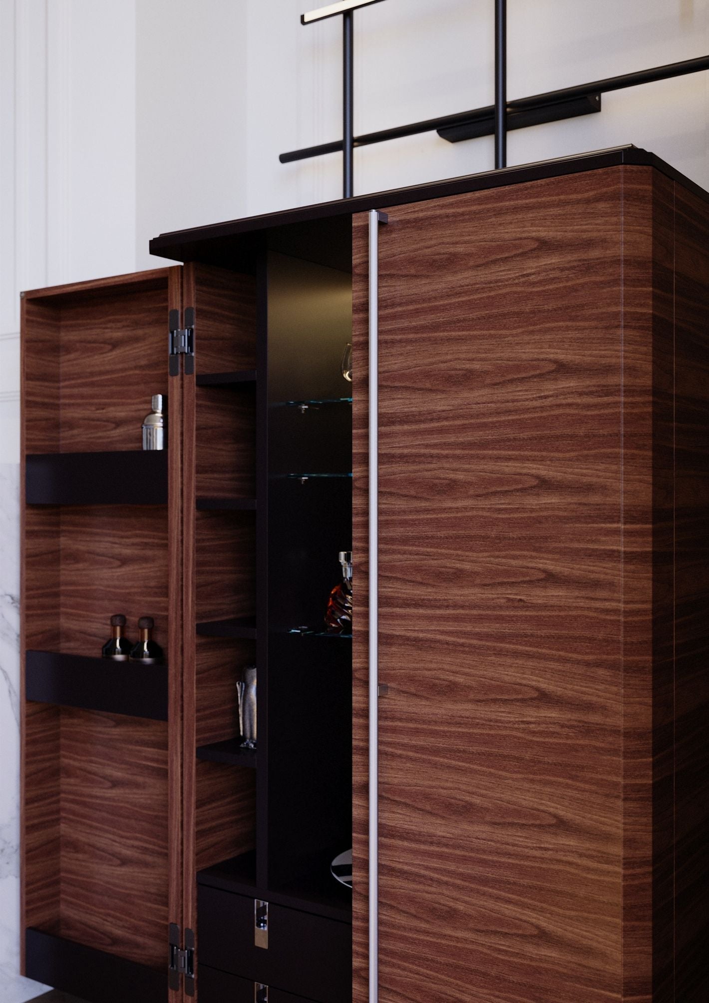 Upon opening the doors, a sumptuous interior is revealed: an etched rear mirror, glass shelves, smart motion-activated LED lighting, two leather-lined drawers, and integrated bottle storage. A true masterpiece for lovers of design and beautiful objects.