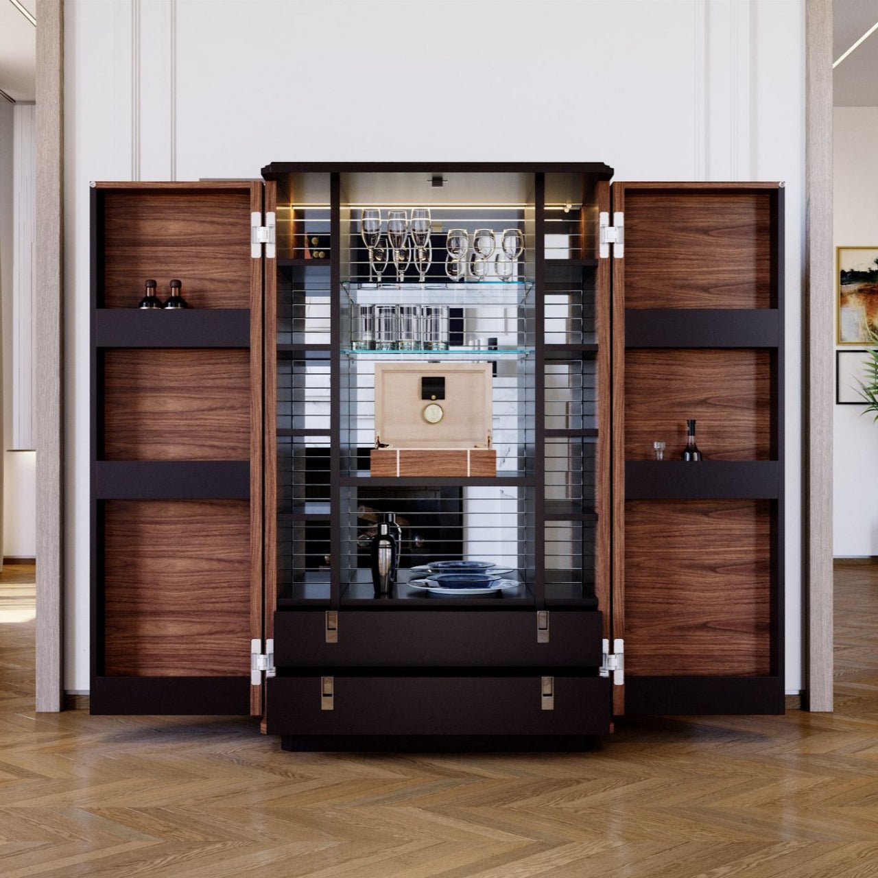Upon opening the doors, a sumptuous interior is revealed: an etched rear mirror, glass shelves, smart motion-activated LED lighting, two leather-lined drawers, and integrated bottle storage. A true masterpiece for lovers of design and beautiful objects.