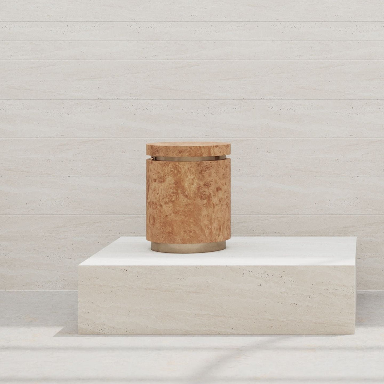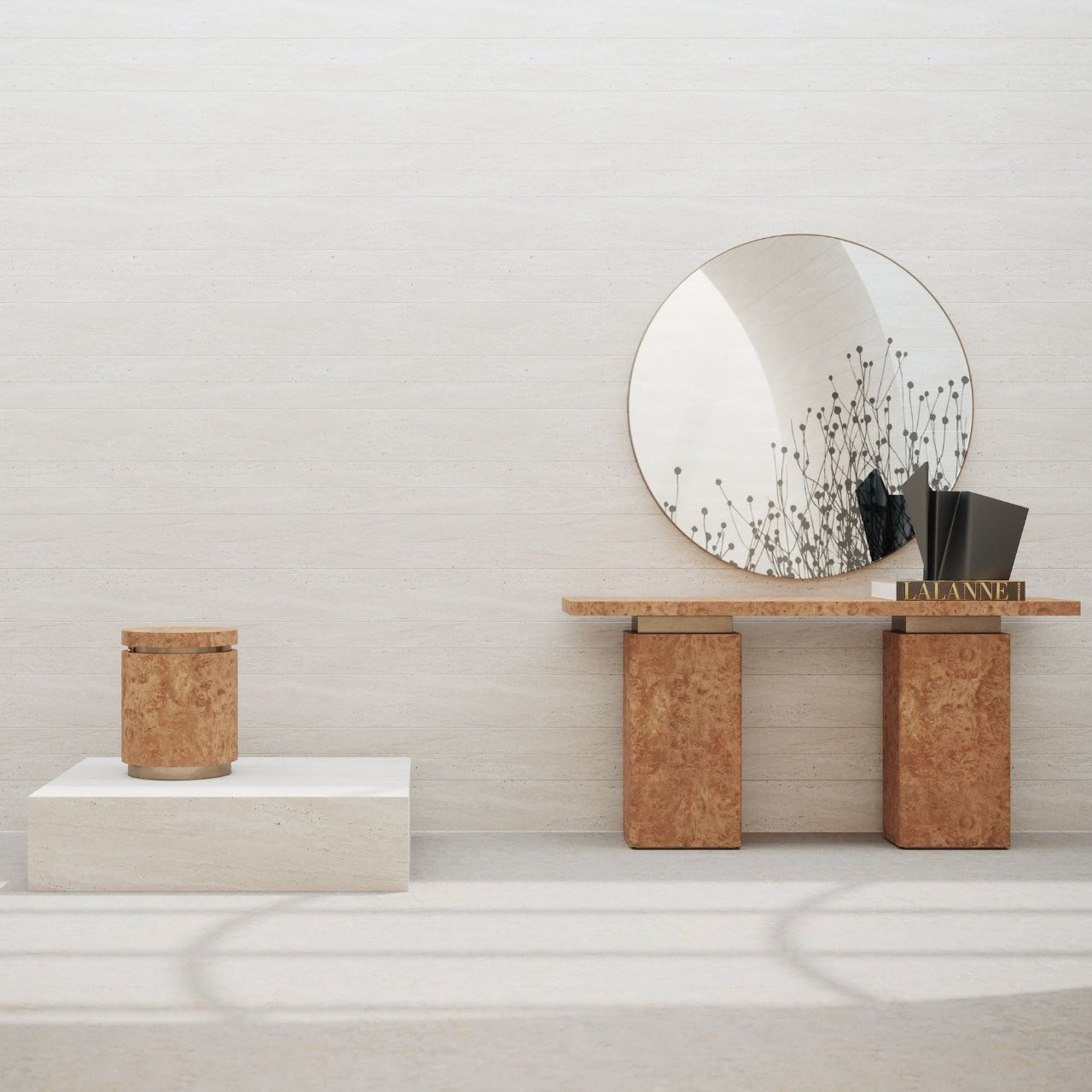 ThereLOUIS side tableis a jewel of discreet and sculptural design. Conceived as a strong piece in a compact format, it combines the natural charm of thechestnut bramble (Radica Castagno)to the subtle brilliance of thebronze cloud.