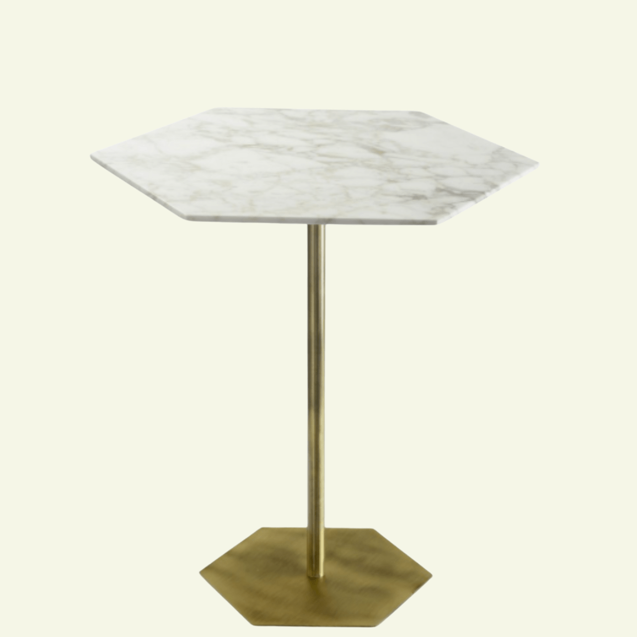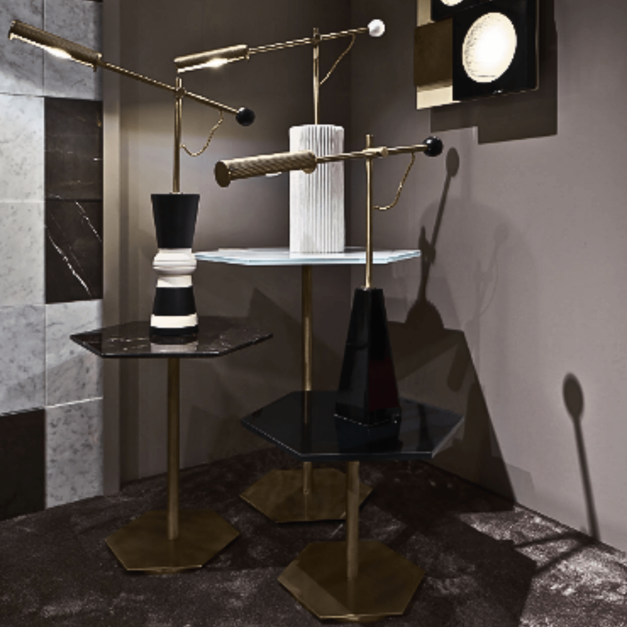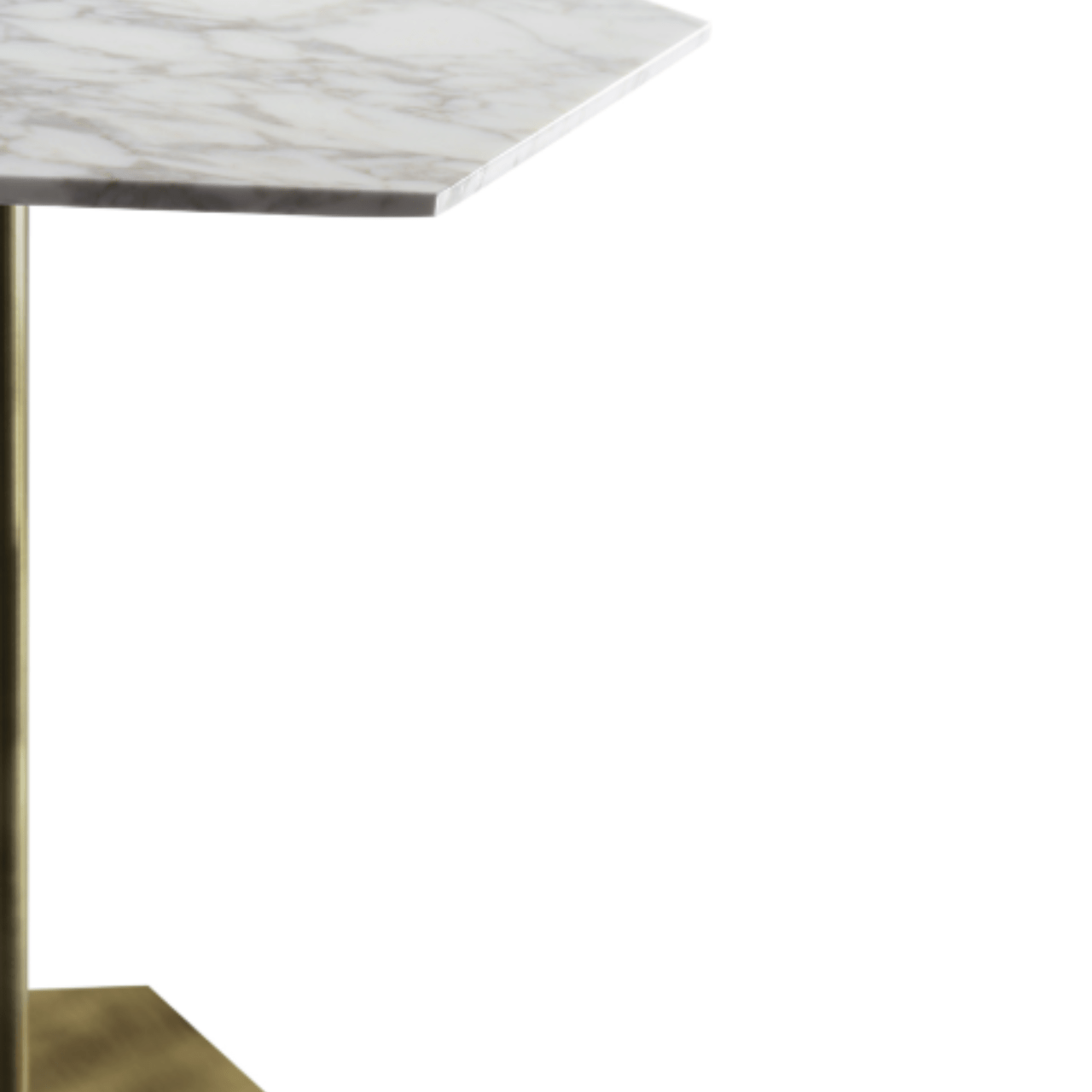 Its base inbrushed brass, both fine and structured, brings a precious and contemporary touch. The slender central foot, placed on a matching hexagonal base, creates a perfect balance between solidity and visual lightness.