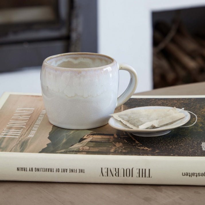 The Brisa cup and saucer, hand-finished in Portugal from fine stoneware, feature organic shapes inspired by the Algarve coast. Its reactive white and blue glaze creates a unique finish, making them perfect for special occasions or everyday use.